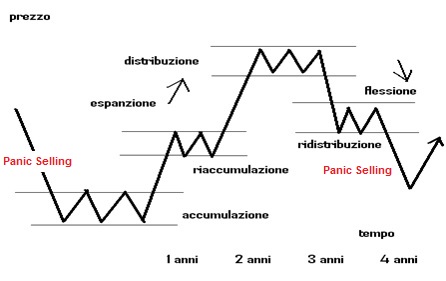 2) ridistribuzione e 3) panic selling (quando la massa si accorge che il mercato è ribassista), i bene informati approfittano in questa fase di scaricare le ultime posizioni rialziste, mentre la massa è convinta che si tratti di una fase di accumulo, ma quando questa fase di congestione è rotta al ribasso, inizia il panico generato da chi ha comprato sui massimi ed iniziano a vendere convinti che tutto crollerà, facendo arrivare i prezzi a valori di sottovalutazione dove le mani forti o bene informati ricominciano a comprare e riprende il ciclo rialzista iniziando da una nuova fase di accumulazione.