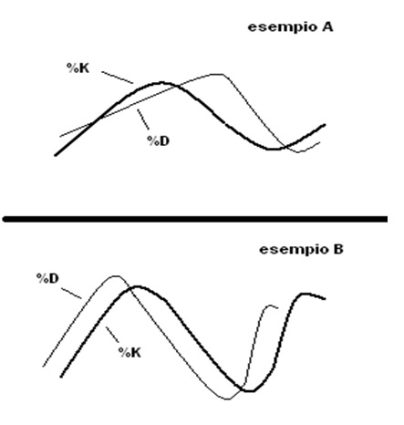 Incroci reciproci delle due linee– generalmente la %K line è più veloce, cambia direzione prima della %D line, l’attraversamento può avvenire prima che quest’ultima inverta la propria – esempio A